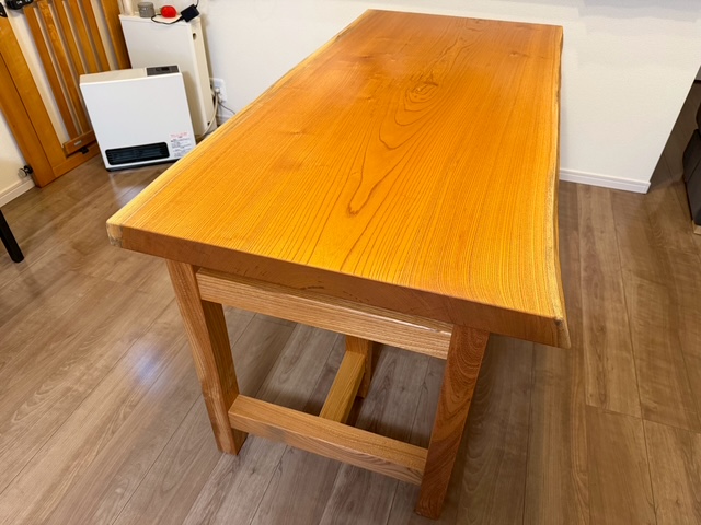 整った形、素直な木目の綺麗なケヤキ一枚板です。 脚もケヤキで製作した兼用脚。 お客様のご希望でロボット掃除機が入るよう高さを調整して製作しました。 S様、この度はありがとうございました。 末永くご愛用頂けましたら幸いです。 今後ともよろしくお願い致します。