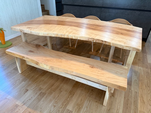 淡くやさしい色合いの中に、流れるように現れた杢目がとても美しい一枚板です。 職人手作りの栃一枚板ベンチもご購入頂きました。 K様、この度は誠にありがとうございました。 今後ともよろしくお願い致します。