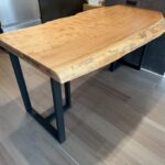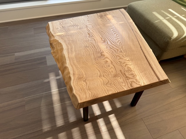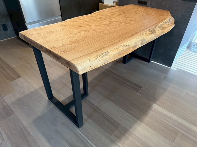 長さ1500mmでカットし、短い方の板にもアイアン4本脚を取り付け、小さなテーブルにしました。 テーブルにできるサイズの栗一枚板は稀少なうえ、綺麗な杢があらわれた貴重な板です。 まだ仕上げ前の板の中からお選び頂きました。 この度はありがとうございました。 末永くご愛用頂けましたら幸いです。